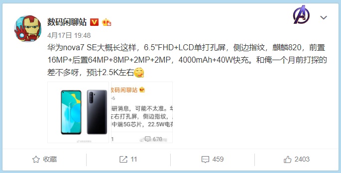 继此前华为nova 7系列手机官宣后,近日博主 @数码闲聊站 也带来了有关nova 7 SE的相关爆料及最新渲染图。