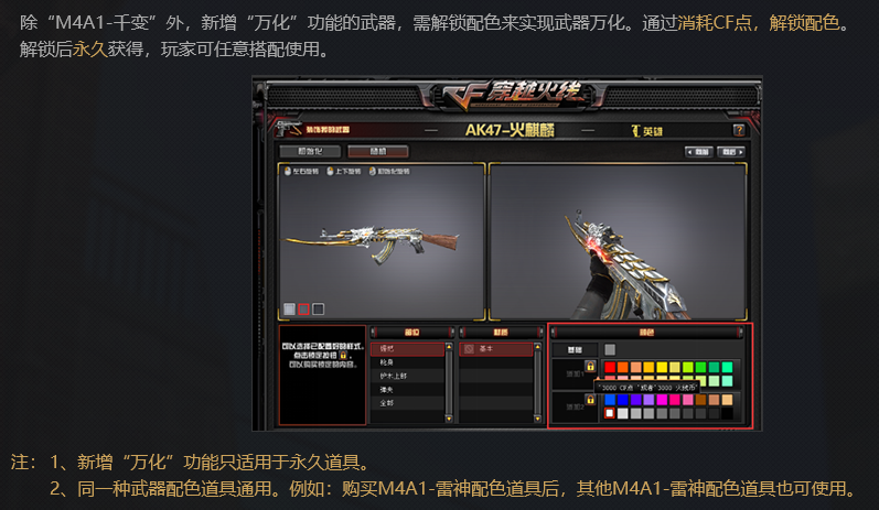 首先个人认为最为重要一点的是,可更换皮肤、以及皮肤英雄级的出现,让万化系统败于下风。纵观大部分的皮肤,都是可以用“从头到脚”来形容,意思就是从枪头到枪托都是带有特定装饰。反观万化这一边,并不能够将枪身所有的部分装饰起来,只是武器的部分。例如火麒麟的刺刀部分就是不能够加上自定义颜色的。无疑这会成为一大遗憾。