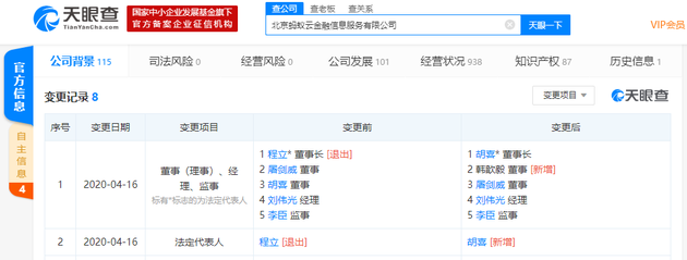 4月20日上午消息,天眼查数据显示,4月16日,蚂蚁金服金融科技的运营主体——北京蚂蚁云金融信息服务有限公司发生工商变更,阿里CTO程立卸任公司法定代表人、董事长,由蚂蚁金服CTO胡喜接任。