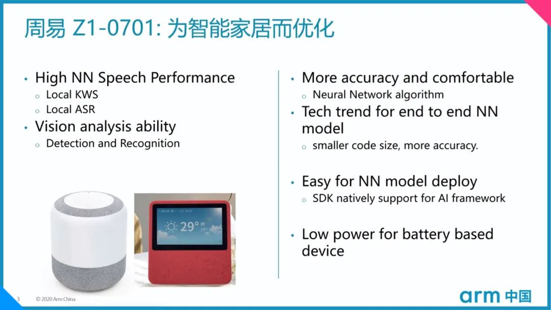Arm Z1-0701 是专门针对智能家居、智能楼宇、智能机器人场景深度定制的,同时也支持比较简单的视觉分析能力,如图像和人脸的识别和感知。