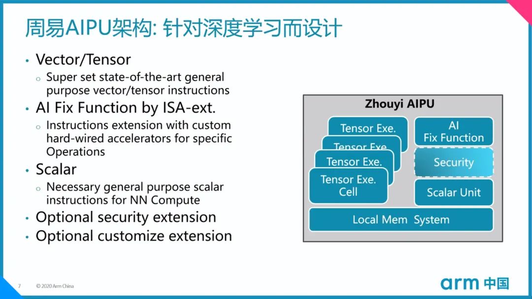 其次是安全扩展。周易 AIPU 传承了 Arm 的 TrustZone 安全技术来保证整个设备里面数据的安全性。在设计之初,就已经考虑了安全保障,使用户隐私得到有效的保障。