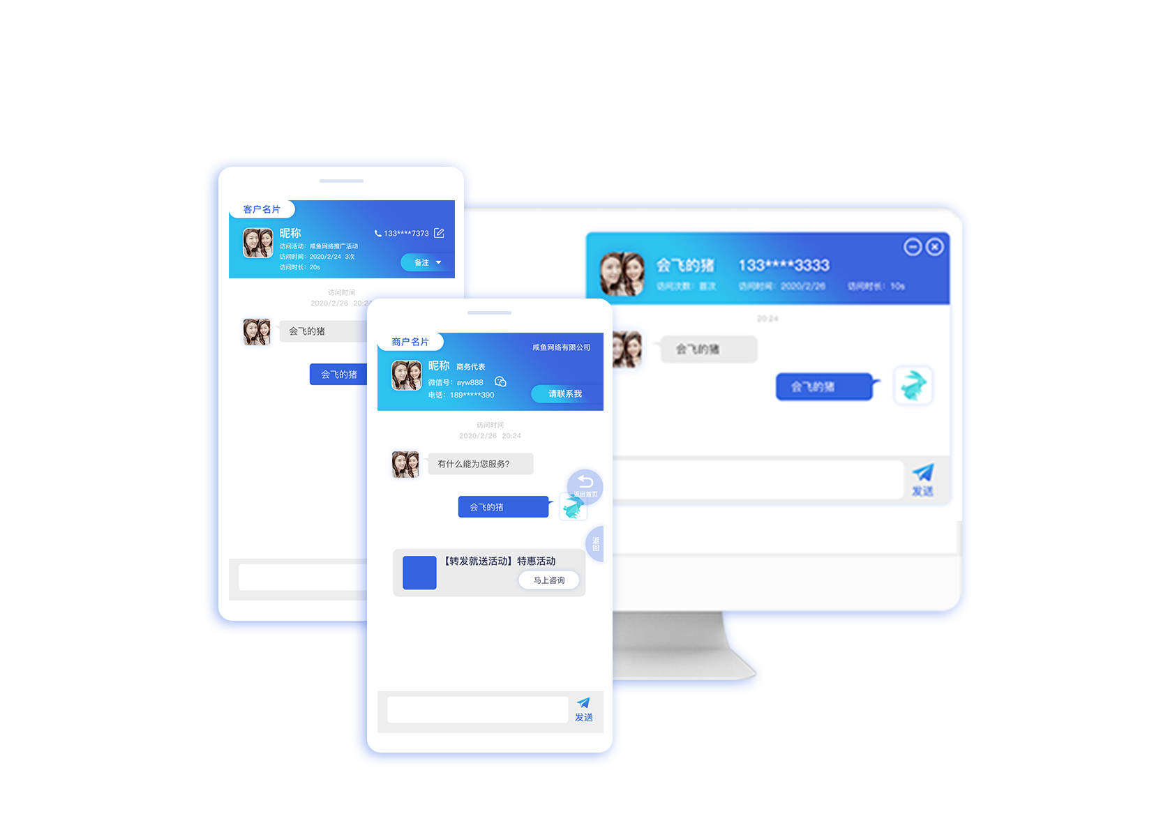 无论客户从什么形式进行转发,朋友圈也好或是小程序名片,游客都可以能和唯一的销售专员沟通,且沟通信息都是具备用户画像的,智能客服轻松应对不同流量入口的客户,第一时间把客户推送给商户。