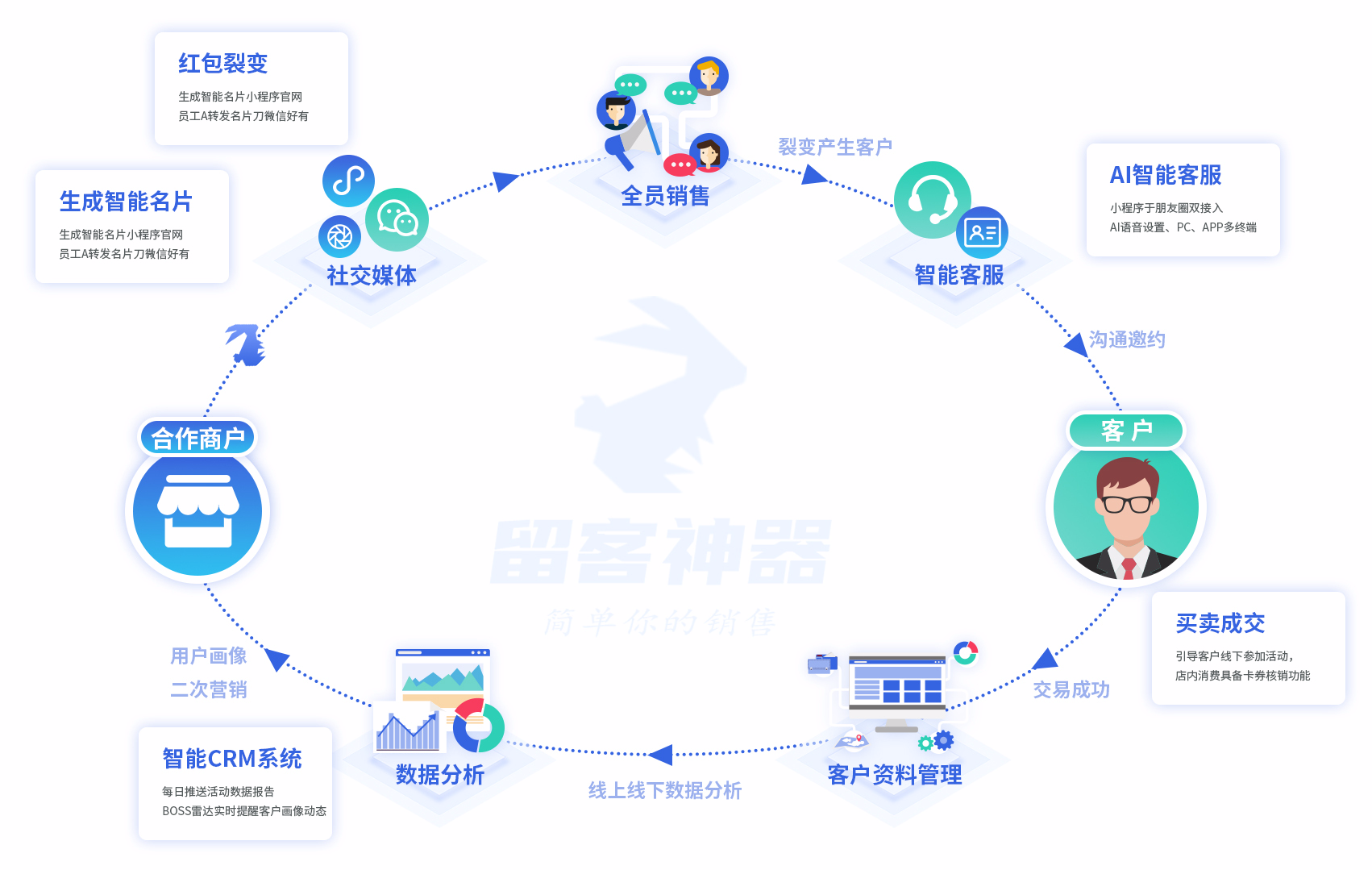 拓推围绕企业销售中面临的实际难题,打造出的留客神器人工智能名片,以先进的智能CRM营销管理理念和专业的技术支持,贯穿企业销售管理的全流程,全方位满足企业营销需求。