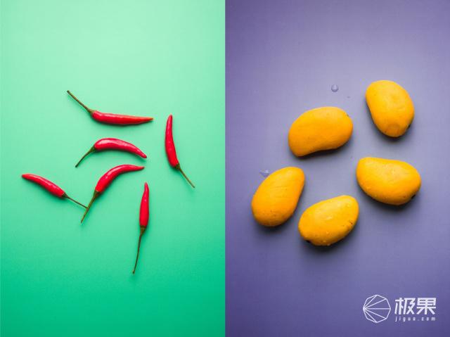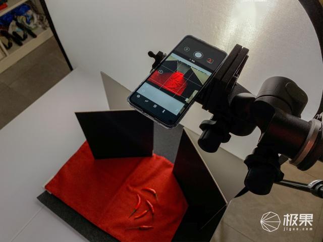 ▼拍摄方式很简单,彩色卡纸/餐布作为背景,正上方放上常亮灯+柔光屏,将手机架好和背景平行,手动选择ISO100,光圈F8,快门根据光线亮度调整即可。