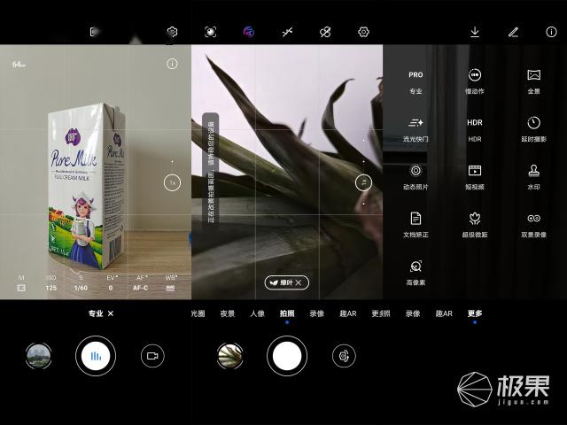 ▼拍摄界面,专业模式可以自定义光圈/快门/ISO/白平衡,适合喜欢手动调节的摄影爱好者。也有傻瓜化的AI模式,自动识别所拍场景进行优化。需要说明的是,为了便于储存/减少文件尺寸,主摄默认输出1600万像素。若要解放6400万全像素,需要在「更多 - 高像素」里打开。