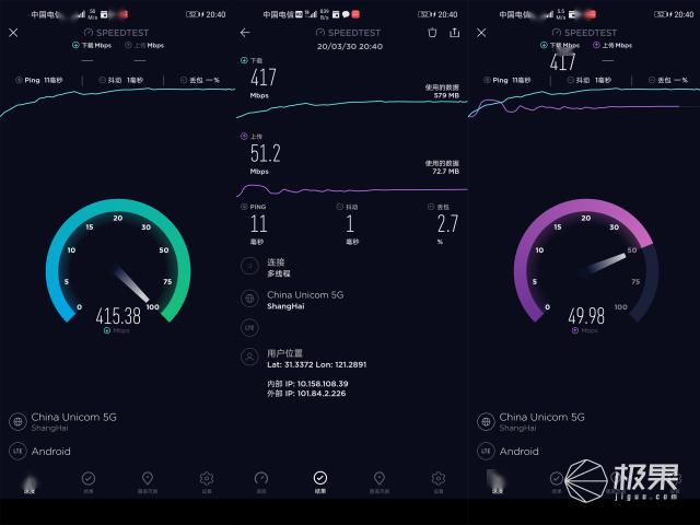 ▼用SPEEDTEST测试,实际的速度也达到了下行415Mbps/上行50Mbps。