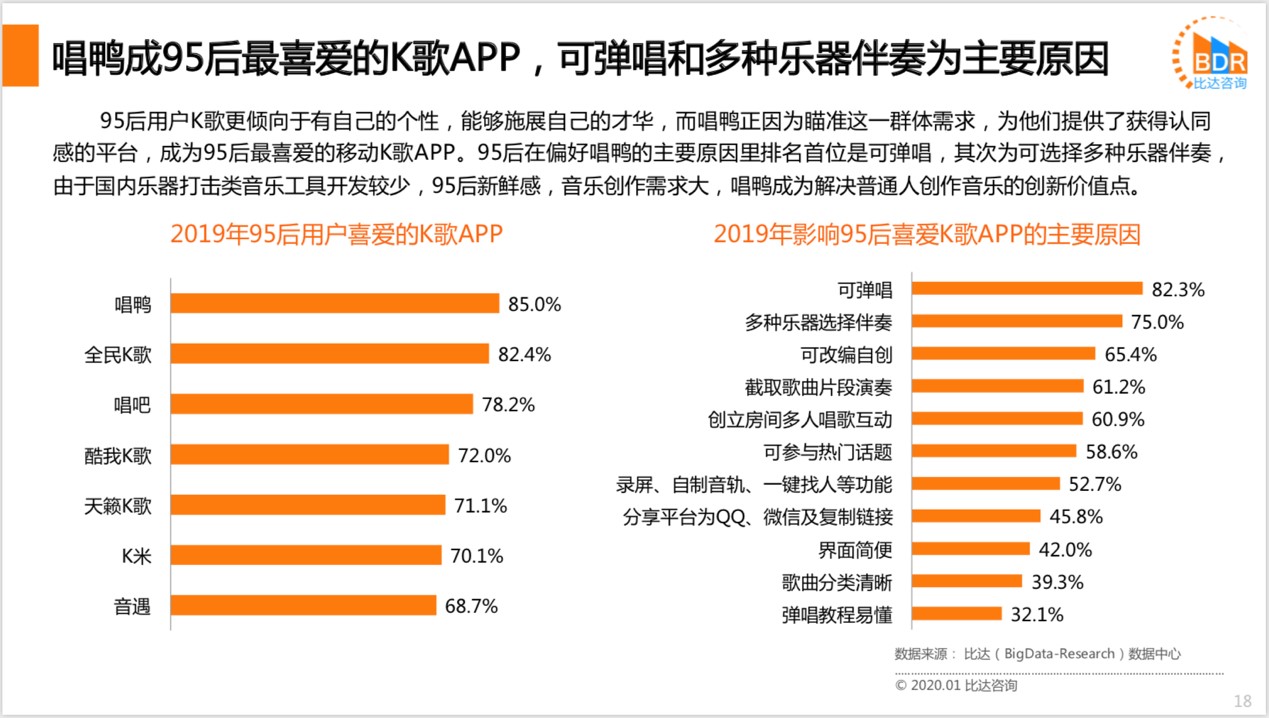 以在线音乐为例,根据第三方数据研究机构比达咨询发布的《2019 年度 95 后用户 K 歌洞察报告》显示,中国在线 K 歌用户规模超过3亿人,其中95 后已经成为主力用户群体,用手机弹唱则成为用户最爱的功能。