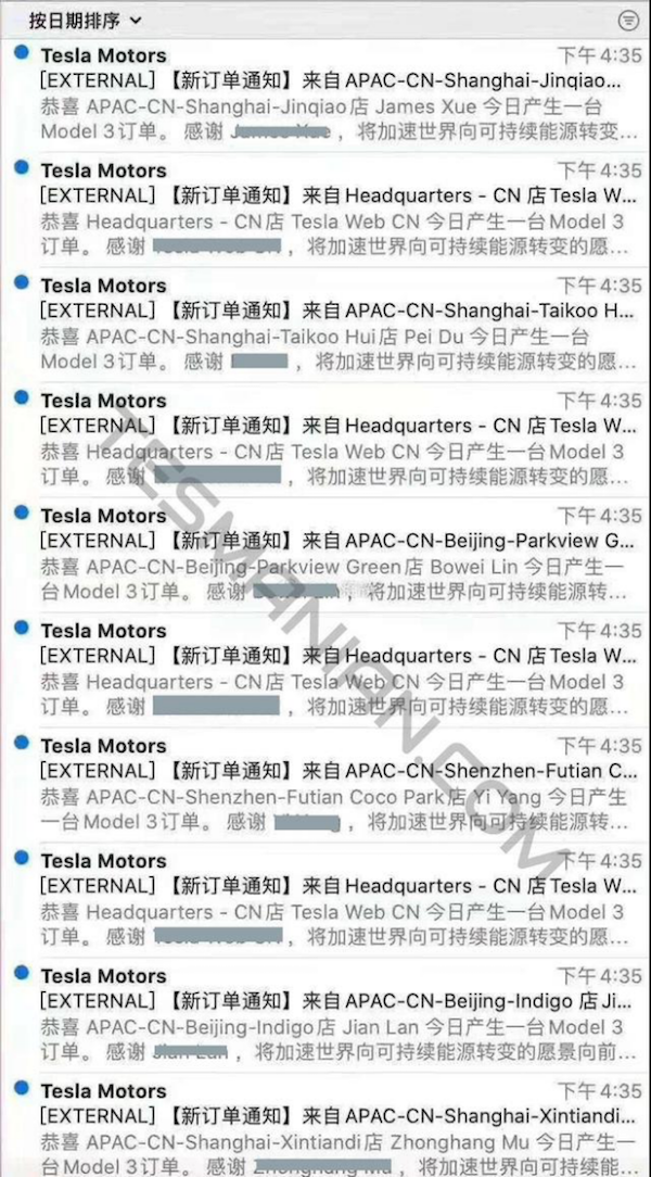 Tesmanian网站报导,自从4月10日国产特斯拉Model 3长续航后轮驱动版与高性能全轮驱动版正式开放预订厚的24小时内,订购数量就突破20,000辆。读者提供的Model 3订单列表手机截屏显示,4月11日下午4点35,一分钟内就有10个订单下定,这些订单来自中国的不同城市。