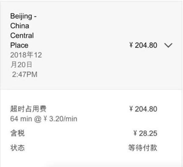 据车主发送的支付界面中我们可以看到,他在2018年有过64分钟的超时占用,账单金额为204.8元(含税)。而且在特斯拉的发文中表示,自4月14日开始,特斯拉充电欠费车辆将被暂停使用超级充电服务,只有将欠费结清后方可恢复使用。