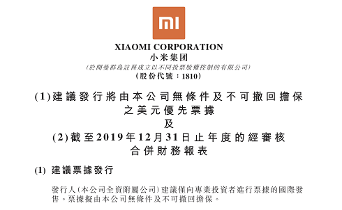 4月20日,小米集团在港交所发布公告,计划向专业投资者发行美元债券,主要用于一般公司用途及偿还现有借款,发行规模、日期、利率等将根据目前市场整体需求而定。