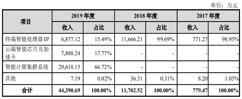 《投资时报》研究员注意到,寒武纪火箭式的增长速度与其产品收入结构有关。据招股书显示,2017年及2018年,该公司主营业务收入主要来源于终端智能处理器IP许可收入。