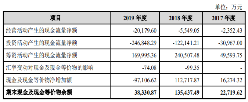 寒武纪便是如此,据招股书显示,该公司经营活动产生的现金流净额分别为-2352.43万元、-5549.05万元及-2.02亿元。