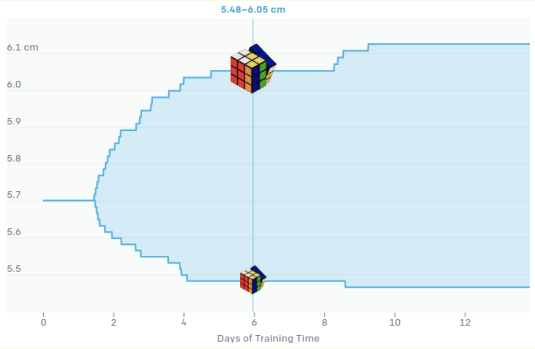 因此,在他们接下来的一篇论文中,他们修改了合成环境,并使其随着时间的推移变得越来越复杂。也就是说,合成数据生成的参数(立方体的大小,摩擦力等)首先在较小的范围内随机分配,并且这些范围随着训练的进行而增长: