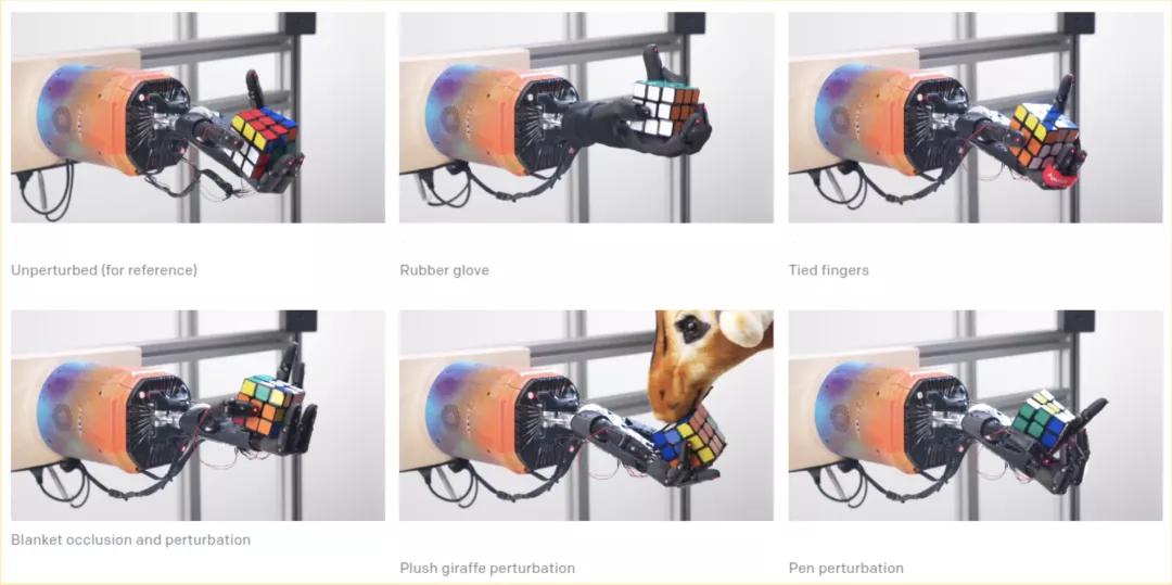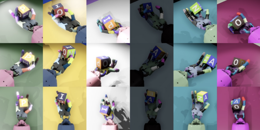OpenAI团队改变调节环境的许多参数,包括视觉参数、物理参数,例如立方体的大小和重量,表面和机器人关节上的摩擦系数,等等。这个是他们不同可视化示例之一:
