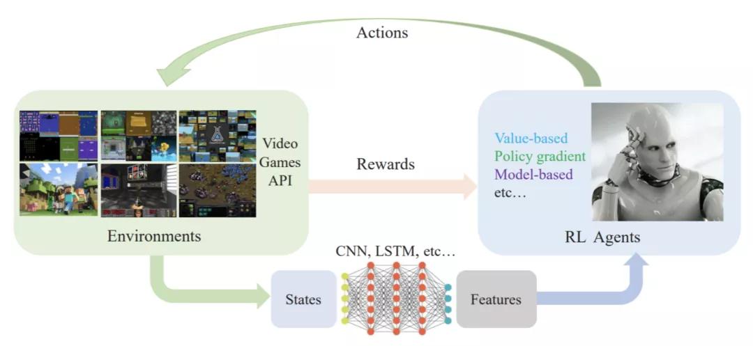 使无数据机器学习成为可能的主要领域是强化学习,智能体在交互式环境中进行学习,从环境中获得执行操作的反馈。通常,强化学习架构包括将环境状态处理为特征的特征提取部分,和将特征转换为执行操作并将环境中获取的奖励转换为权重更新的深度学习智能体。