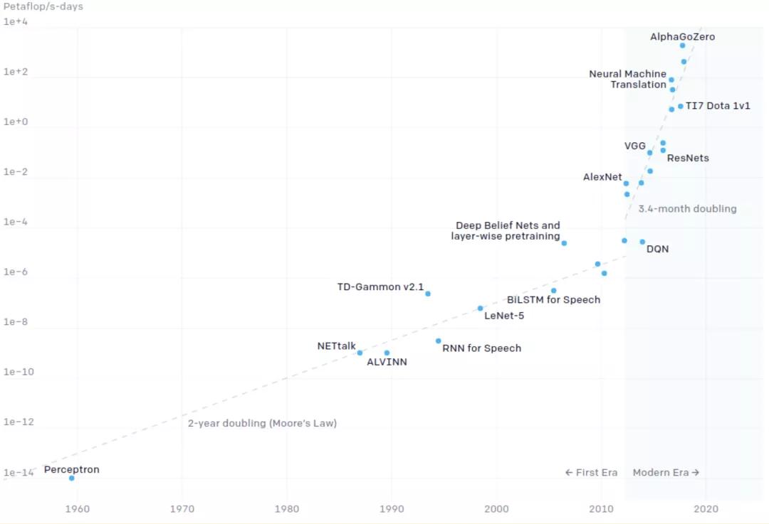 这本身并不能告诉我们太多,但这里有一个来自OpenAI的有趣观察,在2012年之前,训练最先进的AI模型所需的计算资源基本上根据摩尔定律增长,每两年将计算需求增加一倍。但是随着深度学习的到来,2012-2019年顶级AI训练的计算资源平均每3.4个月翻一番!