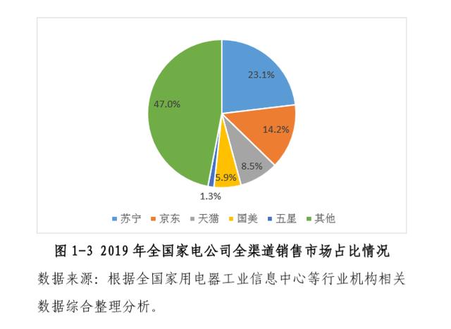 4月13日,商务部研究院发布了《2020年家电消费趋势报告》。从 2019 年家电行业全渠道销售市场份额来看,苏宁家电销售额达 1810 亿元,占据市场份额达23.1%,位居市场首位。京东家电销售额达 1118 亿元,占据市场份额达 14.2%,位居市场第二位;天猫家电销售额达 670亿元,占据市场份额达 8.5%,位居市场第三位。