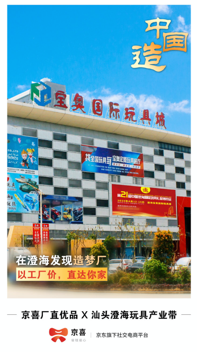 京喜产业带厂直优品计划首站落地广东汕头澄海玩具产业带,当日,京喜与该产业带达成战略合作,在澄海建设首个“京喜产业带合作示范基地“。2020年,逐步卷入澄海约10000个商家;长线来看,京喜将助力澄海玩具产业升级。