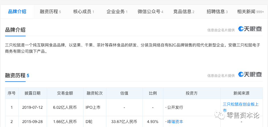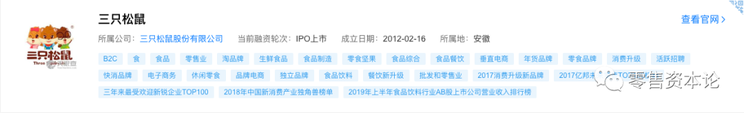天眼查数据显示,三只松鼠是一个纯互联网食品品牌,以坚果、干果、茶叶等森林食品的研发、分装及网络自有B2C品牌销售的现代化新型企业。安徽三只松鼠电子商务有限公司旗下产品。