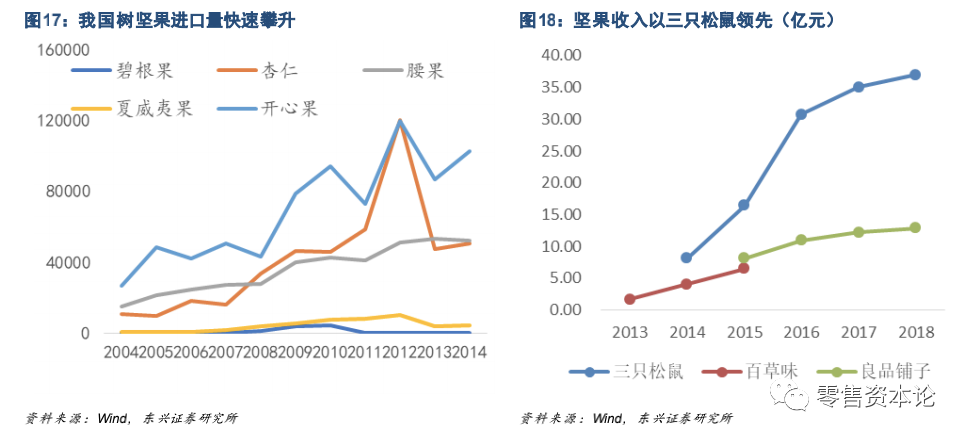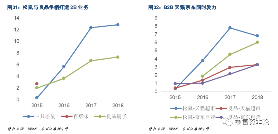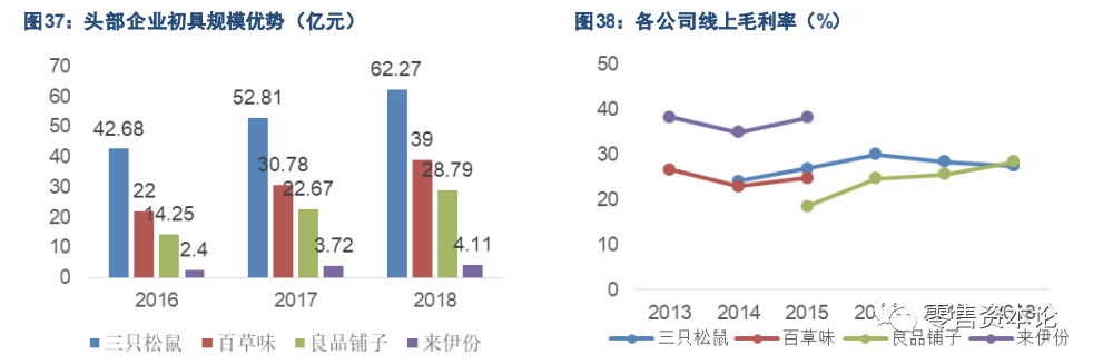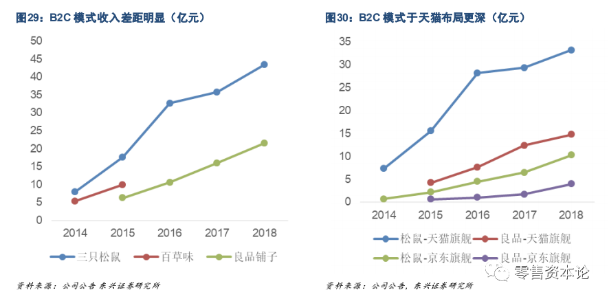 三只松鼠一马当先,18 年收入突破60亿元,百草味、良品铺子略被拉开差距,但仍保持一定增长分别取得39.00/28.79 亿元收入。
