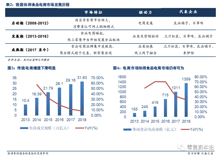 传统电商增长趋缓,预计未来5 年内整体电商成交额增速将保持CAGR=8%,而休闲食品电商将维持CAGR=15%以上。