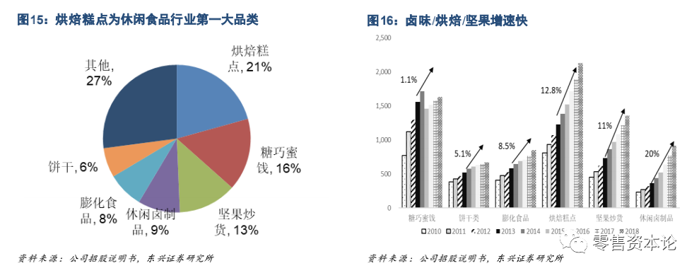 行业红利下卤味/烘焙/坚果增速快。
