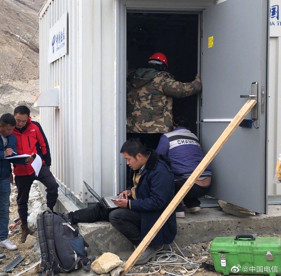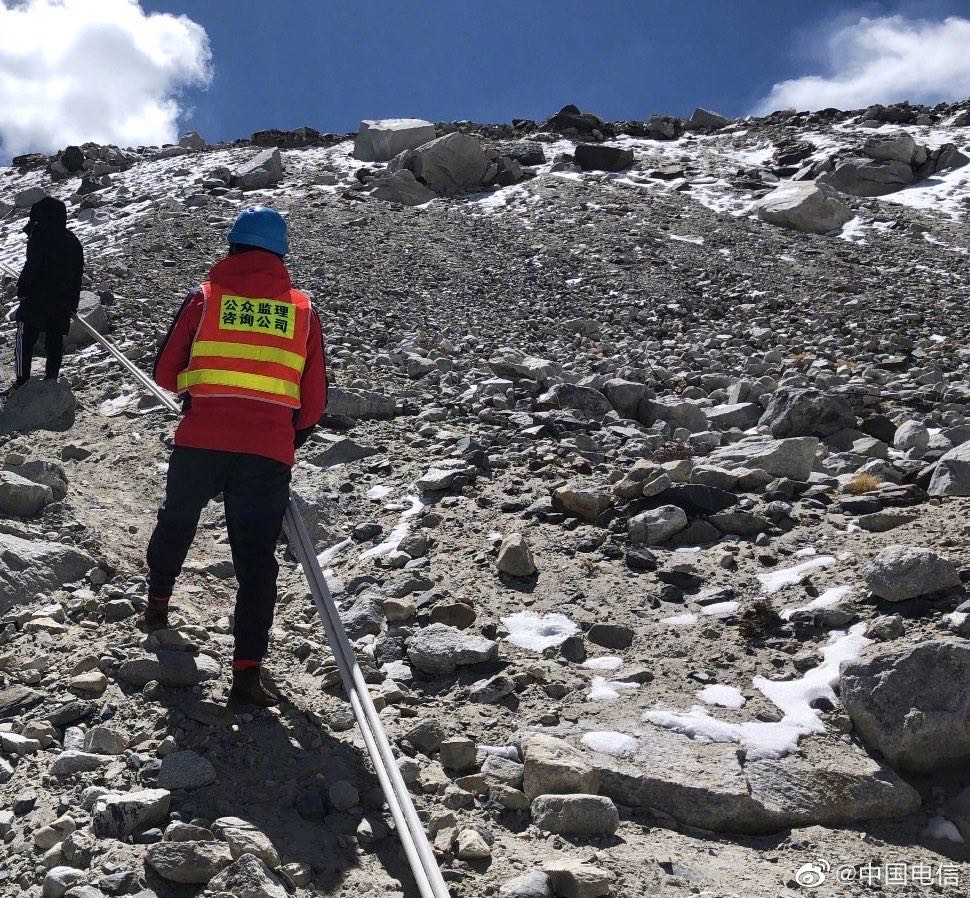 中国电信工作人员在珠峰上进行5G网络建设。微博 @中国电信 图
