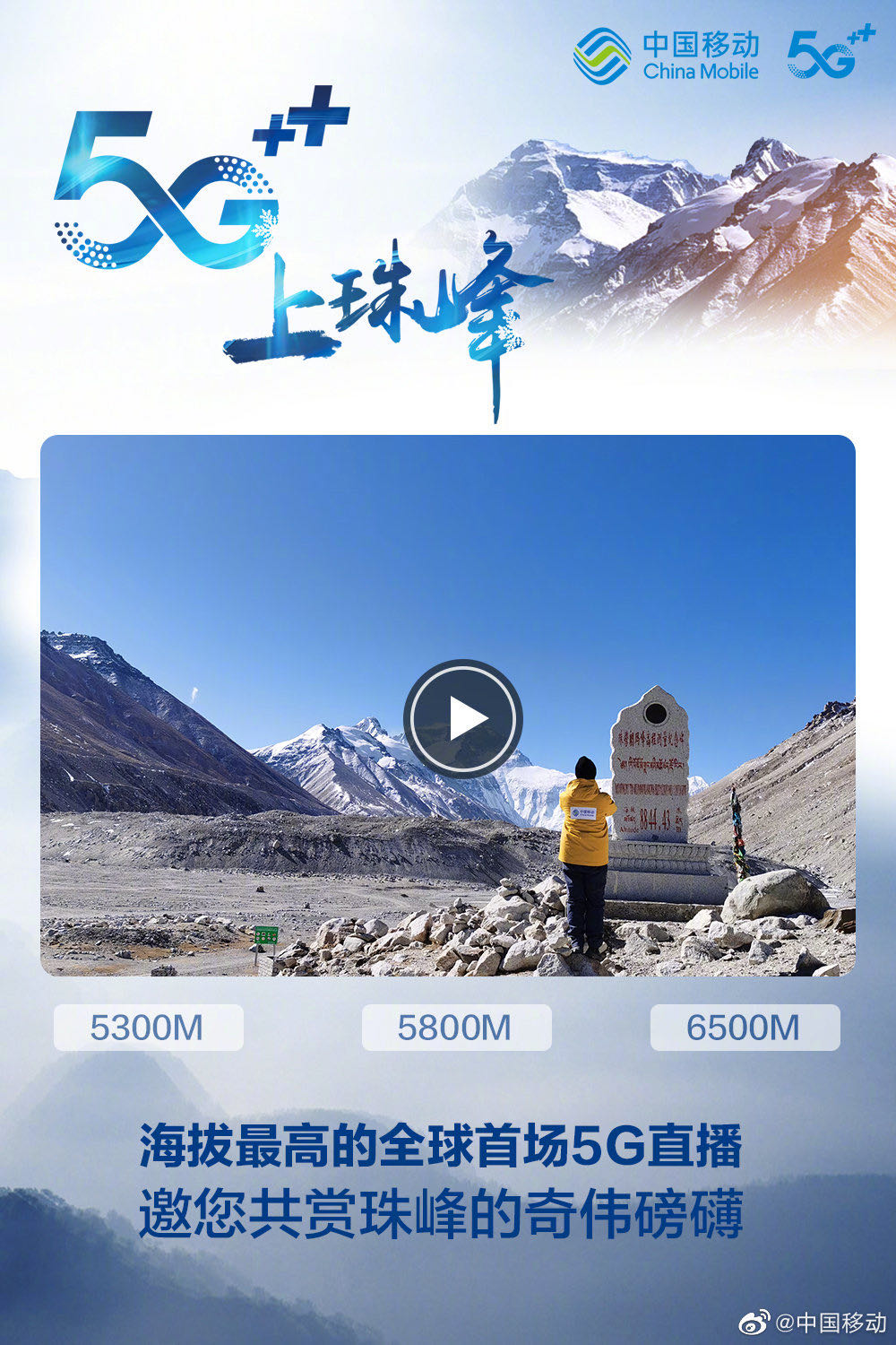 4月20日下午5时30分,中国移动在其微博宣布“世界首个海拔最高5G基站诞生”,中国移动已在珠峰5300米、5800米、 6500米处分别建设开通了5G基站。据前方最新消息,5800米的直播信号测试也已完成,即将上线。届时,中国移动5G信号将覆盖到珠峰峰顶。