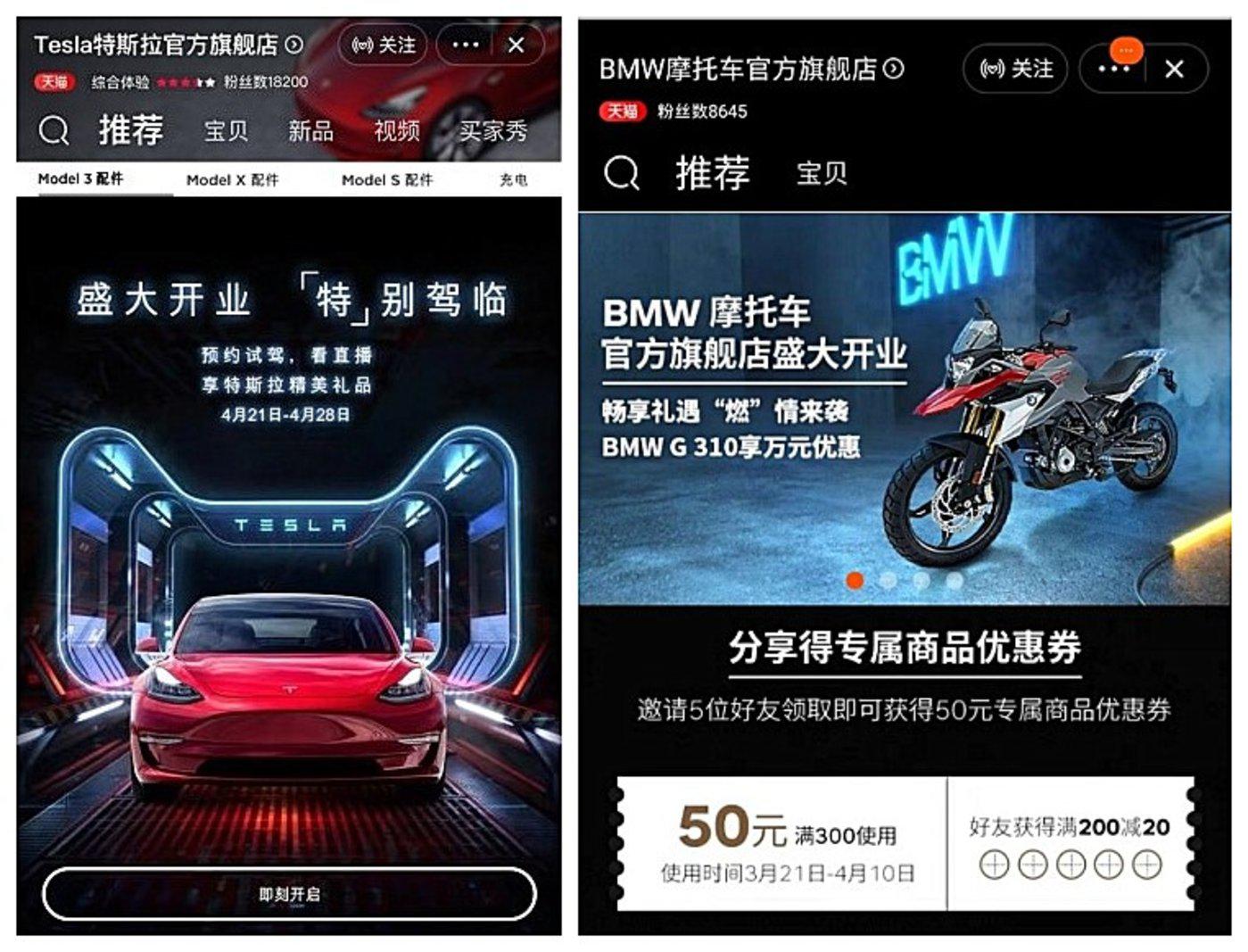 4月16日,特斯拉天猫官方旗舰店正式上线,目前可以在线预约试驾。3月31日,宝马摩托车也在天猫开出旗舰店,3万至35万元不等的摩托车线上开卖,店铺还能领取50元优惠券。