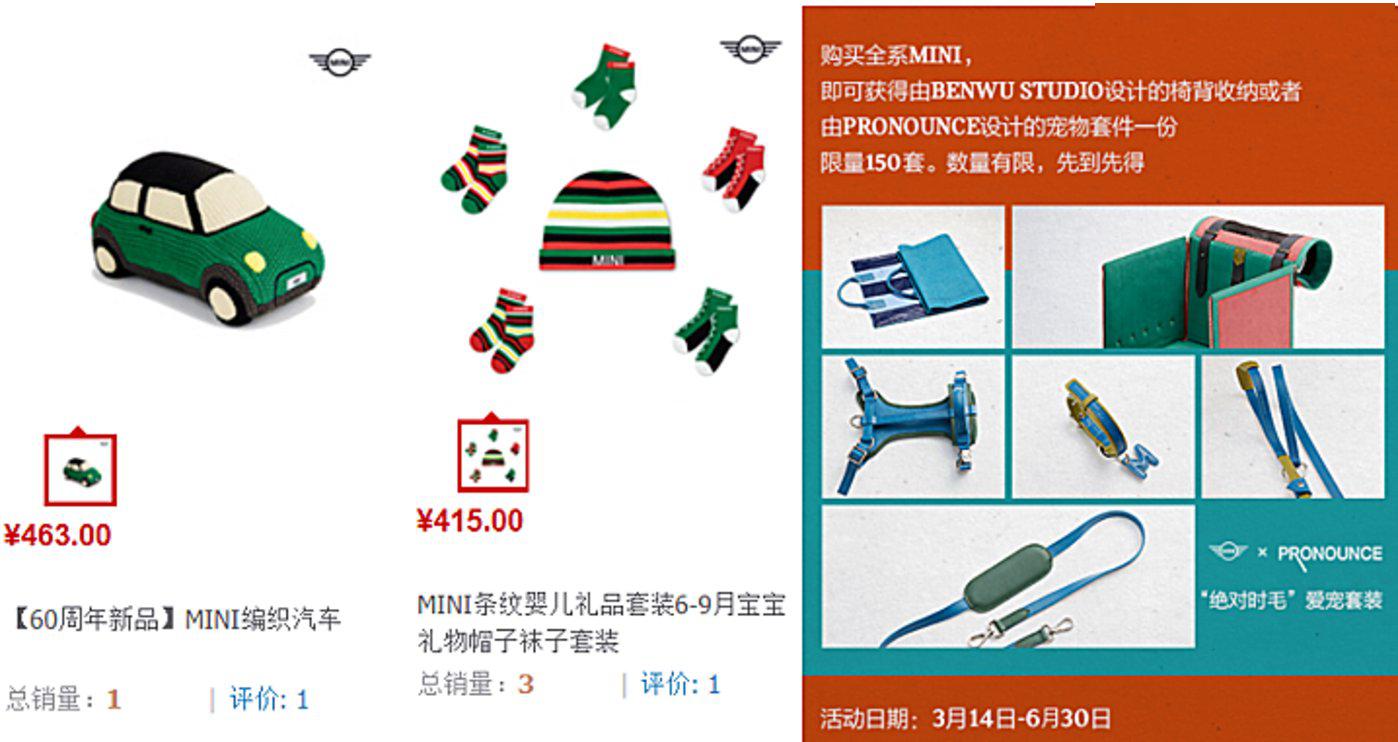 MINI天猫旗舰店还出售针织的车模、配色活泼的婴儿帽袜,订购新车还能获赠包括牵引绳、宠物包在内的联名宠物套件。带着萌娃、爱宠出行,MINI可能想打入更多家庭场景。
