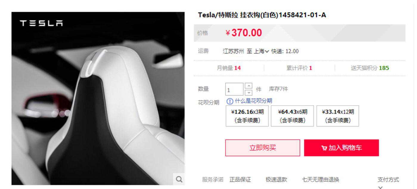 刚开网店的特斯拉画风倒还正常,车钥匙、脚垫等,一水儿的汽车配件,但370块钱2个的衣服挂钩?打扰了……