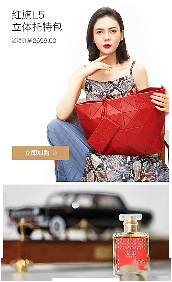 国产豪车品牌又怎么样呢?点开一汽红旗官方旗舰店,你可能会感受到另一种画风。活动价也要卖2699元的中国红托特包,款式看上去似曾相识……此前,红旗文创微信公众号还曾上新过红旗香水,“前调,强烈而坚毅,如秀木屹立于林,志存高远……”网友表示“喷上就一身正气”。