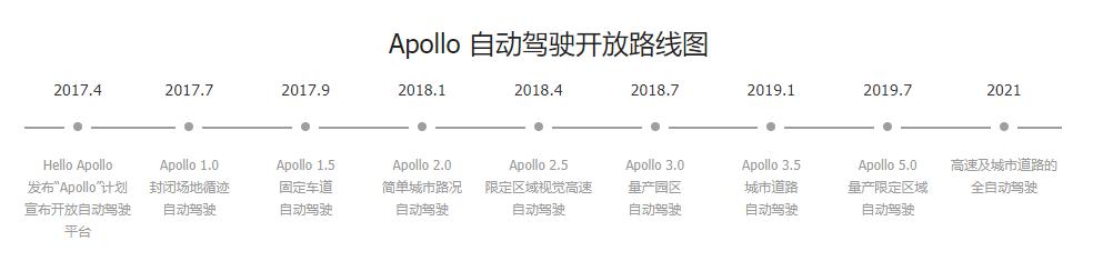 2013 年百度无人车项目起步,2017 年 4 月的上海车展上,正式公布 Apollo 计划,在接下来的 2 年时间,百度 Apollo 逐渐完成在封闭场景、固定车道、简单城市路况、限定区域高速、复杂城市道路、城市点对点等一系列自动驾驶能力的开放,在能力增强的同时,百度 Apollo 也在推进 Robotaxi 的量产和落地。