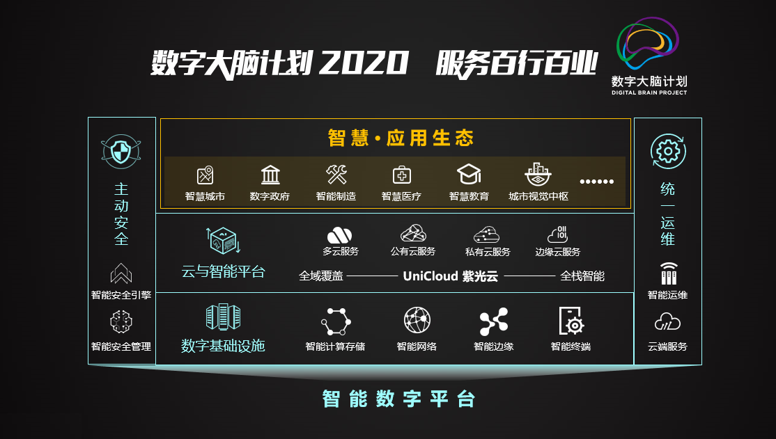 为了更好与客户携手迎接“智变”时代,新华三隆重发布了全新的“AI in ALL”智能战略,致力于让自身的产品和解决方案更具智能,同时助力客户的业务与运营更智能。在智能战略的引领下,新华三发布了全新升级的“数字大脑计划2020”。2019年首次发布的数字大脑计划,以数字基础设施、业务能力平台、主动安全和统一运维构成的智能数字平台为基础,与生态合作伙伴开展智慧应用领域的创新。在“数字大脑计划2020”中,除了继续将智能技术全面应用于数字基础设施、主动安全及统一运维中之外,更将业务能力平台全面升级为云与智能平台。紫光集团成立了紫光云与智能事业群,将云与数字化业务提升为集团核心战略。整合私有云、公有云、人工智能、视频云、软件服务能力,实现技术、品牌、市场、服务全面统一,以全新打造的“紫光云”品牌面向市场,致力于成为智能时代百行百业数字化转型的最佳合伙人。以新面貌登场的“紫光云”将提供公有云、私有云、边缘云以及多云服务的全域覆盖能力,满足市场多元化的需求,同时把智能化技术全面应用到数字中台、数据引擎、安全服务、视觉能力平台等,以全栈智能、全域覆盖和全场景应用赋能百行百业的数字化和智能化。