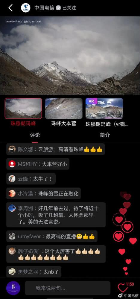 图片来源:中国电信中国电信之后,4月20日,中国移动也在官方微博宣布为纪念中国登山队成功登顶珠穆朗玛峰60周年,推出云端看珠峰的“4K+VR慢直播”活动。