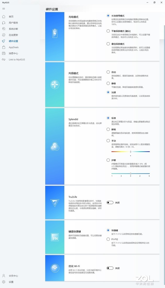在进行性能测试之前需要说明一点,华硕灵珑II内置了MyASUS应用(F12快速开启),在硬件设置部分提供了多个选项,包括充电模式、风扇模式、Splendid(屏幕色彩)、Tru2Life(视频增强)、键盘快捷键、优化Wi-Fi等功能,其中风扇模式有自动、静音和加速三个子项,该部分除了控制风扇转速外,也会对性能有影响。这部分也是华硕灵珑II宣传中的“Turbo模式”。我同时在自动和加速模式下测试了华硕灵珑II的性能表现,所以每项测试会有两个结果。