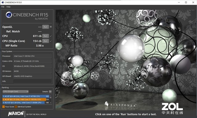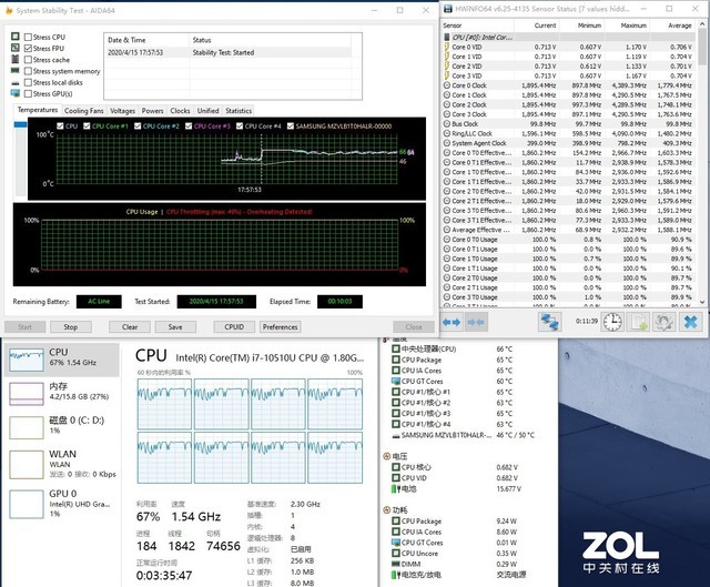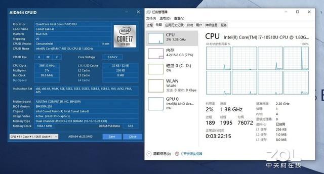 处理器测试,华硕灵珑II采用了i7-10510U,这是英特尔最新十代酷睿产品,代号Comet Lake-U,拥有四核心八线程,基础频率1.8GHz,单核最大睿频为4.9GHz,全核最高频率4.3GHz,三级缓存8MB,TDP为15W。