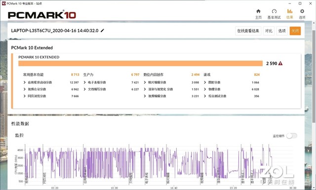 加速模式下得到总分2590,其中常用基本功能8713分、生产力6797分、数位内容创作2494分、游戏824分。