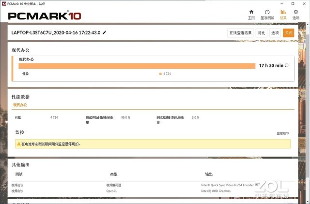 华硕灵珑II内置了66Wh的电池,算不上特别大,在14英寸中属于中等偏上水平。使用PCMark 10现代办公模式进行续航测试,测试环境为:室温22°、屏幕亮度151cd/m2(亮度72%)、连接Wi-Fi、音量50%。最终自动模式下续航成绩竟然高达19小时1分钟!加速模式下也达到了17小时30分钟!