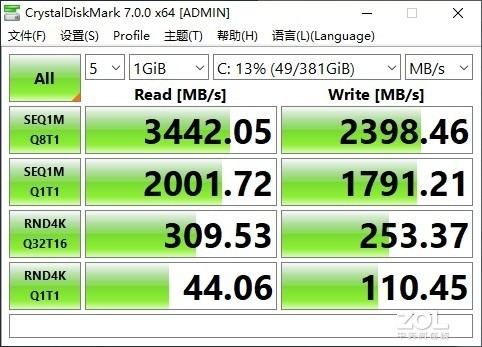 自动模式下,队列为8线程为1时,持续读取3442.05MB/s,持续写入2398.46MB/s;队列为1线程为1时,4K随机读取44.06MB/s、4K随机写入110.45MB/s;