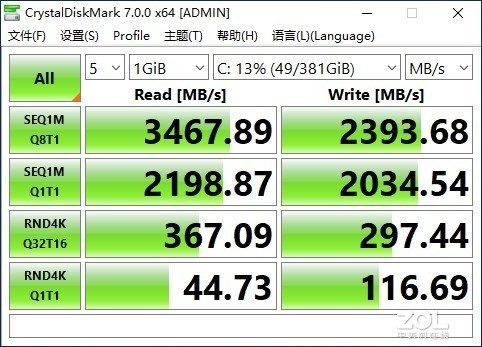 加速模式下,队列为8线程为1时,持续读取3467.89MB/s,持续写入2393.68MB/s;队列为1线程为1时,4K随机读取44.73MB/s、4K随机写入116.69MB/s;