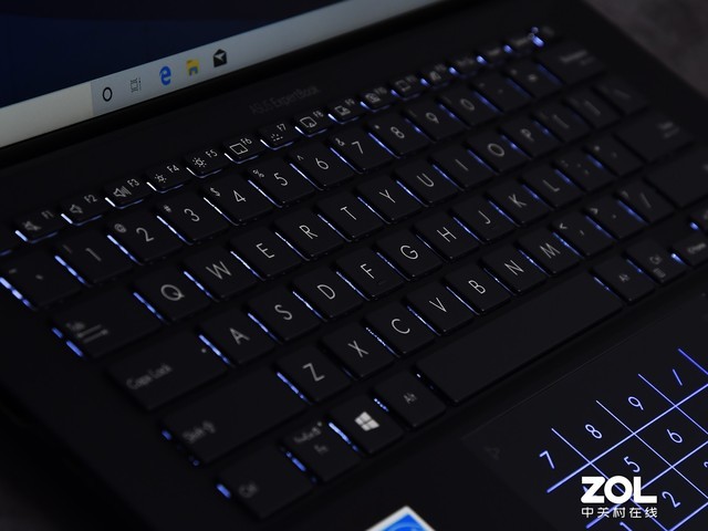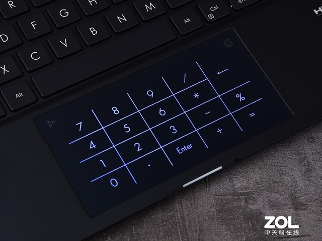 不简单的是,这块触控板集成了“数字键区”。这是华硕的一项技术,名字为NumberPad2.0,单从名字也能看出,可方便输入数字,而且还是第二代技术。触控板两个角有两个图标,右上角可开启数字键区,长按即可,这时候大家就可以在触控板上看到大尺寸笔记本上才有的数字键区,同时依旧可以通过触控板控制指针。左上角可调节亮度,同样是长按,调节虚拟按键的亮度,2级可调。此外,从左上角图标向内划,可快速呼出计算器,非常方便。这也是调节亮度操作设置成长按的一个原因,当然也有可能是为了防止误触。