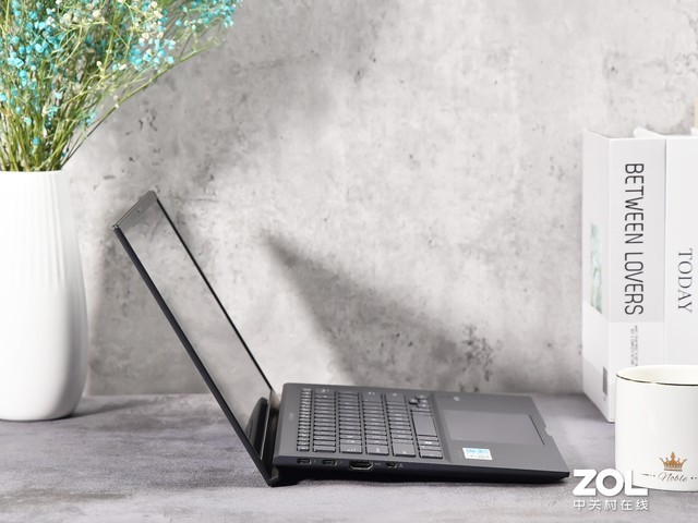 最后是“小翘跟”转轴,这在灵珑系列上并非首次出现,其他品牌产品也有类似设计,这里简单说一下该设计的优势。“小翘跟”转轴可以将机身撑起,使机身与桌面有一定角度。稍微倾斜的机身提升打字时的舒适度,同时底部与桌面空间更大,有利于散热。