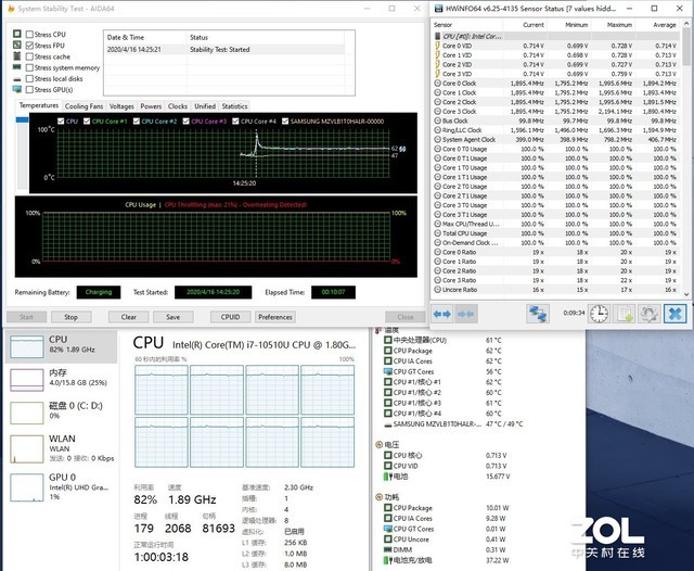 CPU压力测试,自动模式下单拷FPU 10分钟,处理器频率在1.34GHz-1.89GHz之间浮动,功耗则在7W-10W之间浮动,核心温度在61°-65°之间浮动;加速模式下单拷FPU 10分钟,处理器频率稳定在1.89GHz,功耗稳定在10W,核心温度最高62°。单拷CPU结果已经相当明显,即使在加速模式下,华硕灵珑II对处理器的性能控制也相当严格,性能依旧维持在比较温和的状态。这种设定更多考虑了产品面向用户的使用环境,因为如此温和的性能释放足以应对日常办公环境,同时还带来了低噪声、长续航、低温的使用体验。华硕灵珑II在CPU性能方面的取舍是比较符合产品定位的。