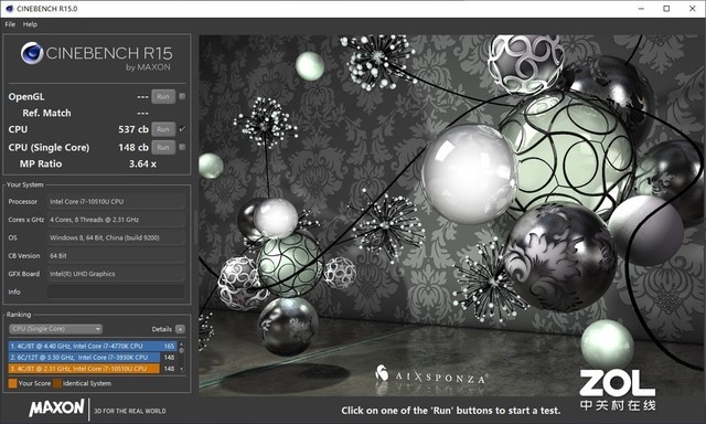 实测自动模式下,Cinebench R15多核成绩为537cb、单核成绩为148cb;Cinebench R20多核成绩为1006pts、单核成绩为367pts。从测试成绩上看,性能释放偏保守;