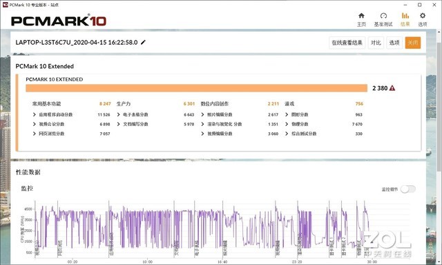 整机性能测试,使用PCMark 10 Extened模式进行测试,自动模式下得到总分2380,其中常用基本功能8247分、生产力6301分、数位内容创作2211分、游戏756分;