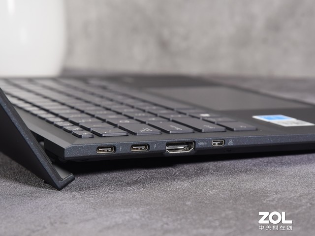 要说方便,必须先说接口。华硕灵珑II的接口种类比较多,其中机身左侧有2个雷电3(共享40Gbps带宽)、标准尺寸HDMI2.0和Mini RJ45,官方附赠了RJ45转接Mini RJ45工具,方便连接网线;机身右侧有Kensington锁孔、USB3.2 Gen 2(10Gbps)和3.5mm耳机麦克二合一接口。接口种类很全,接网线、显示器、USB鼠标、扩展坞、显卡坞都可以,其中依旧保留Mini RJ45,目的是固定mac地址方便企业IT管理。