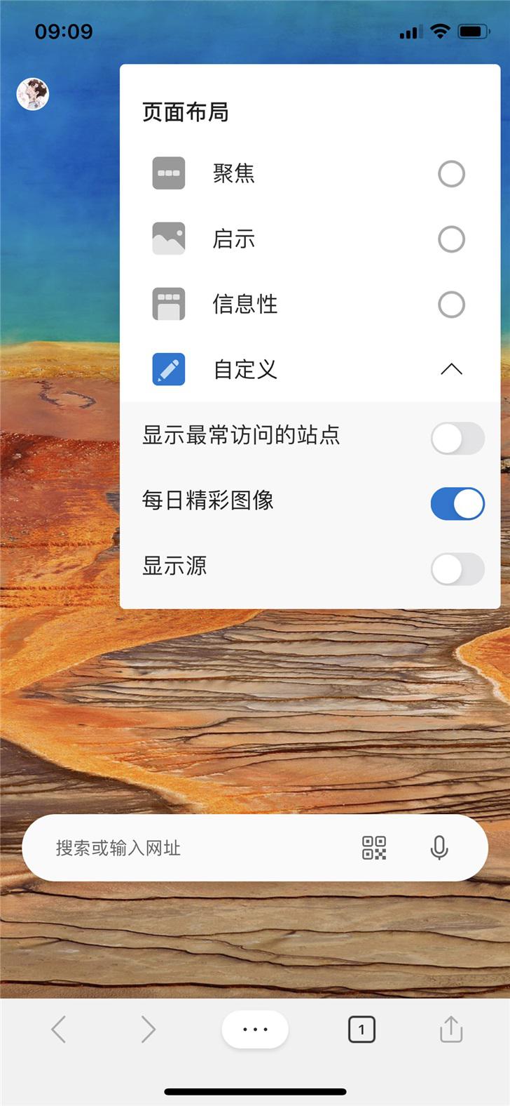 目前,Microsoft Edge iOS版页面布局包括聚集、启示、信息性与自定义四种模式。其中,在自定义模式下,用户可选择打开或关闭显示最常访问的站点、每日精彩图像与显示源。