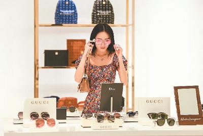 近日,海南三亚国际免税城在海南三亚市增开了两家免税体验店。顾客可在免税体验店内体验商品后,在网上下单购买。图为一名顾客在新开于三亚红树林度假酒店内的免税体验店体验商品。蒲晓旭摄(新华社发)