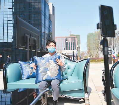 在江西省赣州市南康区跨境电商产业园,销售员工通过手机直播的形式推销家具。新华社记者 胡晨欢摄